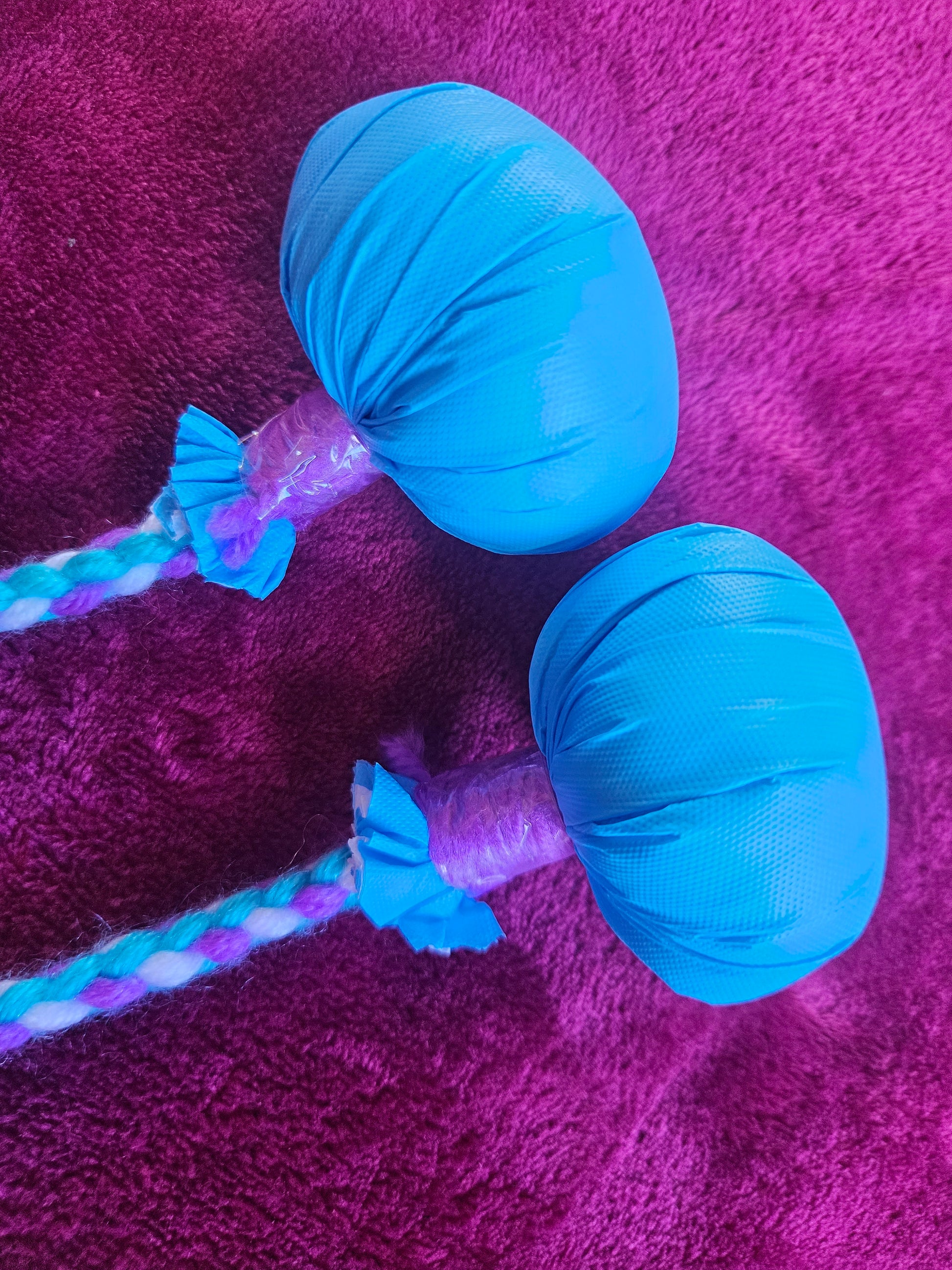 All our Poi are woven and handcrafted using 100% 8ply acrylic knitting yarn, recycled polyester filling and plastic sheet covers.