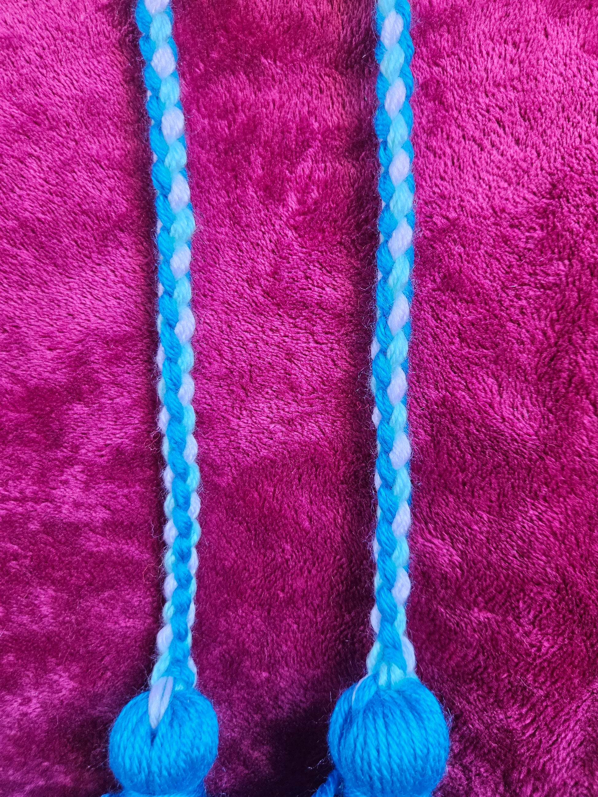 Our poi cords (spine) and pompoms (tails) are all made with Acrylic Yarn. The ball (head of the Poi) is made with polyester filling and Plastic sheet, molded and wrapped tightly and knotted with Acrylic Yarn for stabilisation.